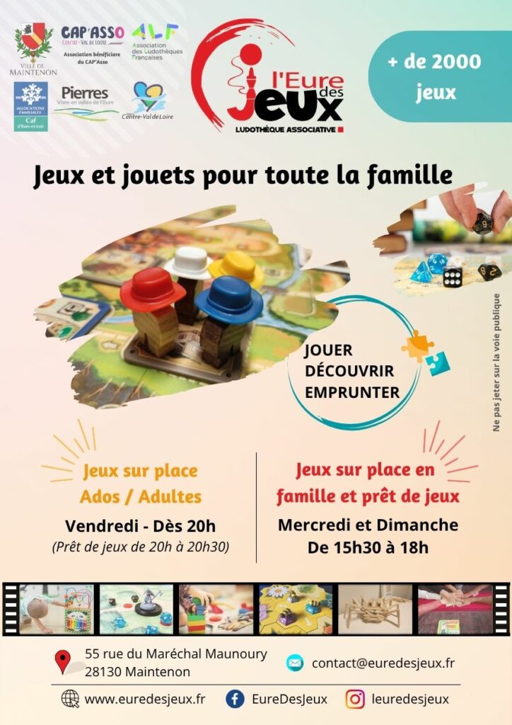 - Les mercredis et dimanches de 15h30 à 18h00 pour le prêt et le jeux sur place !